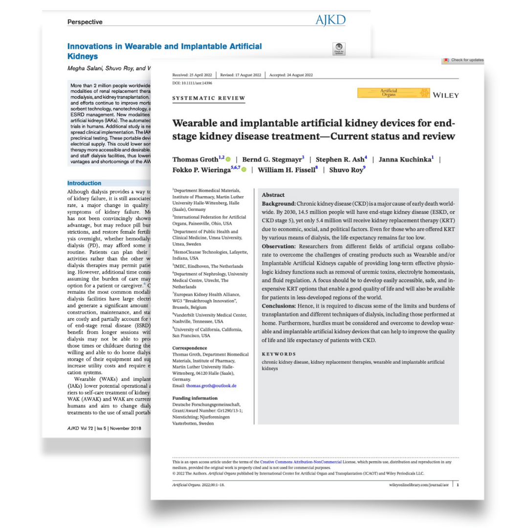 - Salani M, Roy S, Fissell WH 4th. Innovations in Wearable and Implantable Artificial Kidneys. Am J Kidney Dis. 2018 Nov; 72(5):745-751. doi: 10.1053/j.ajkd.2018.06.005. Epub 2018 Aug 23.